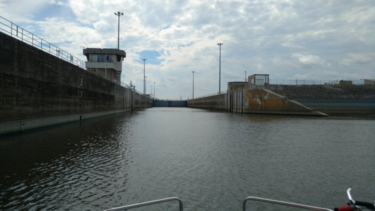 Reg pilots us through Lock 27, last Lock on the Mississippi. Again, the lock through goes quickly thanks to having the auxiliary Lock. This lock has an entrance gate that goes up and down, instead of swinging open.