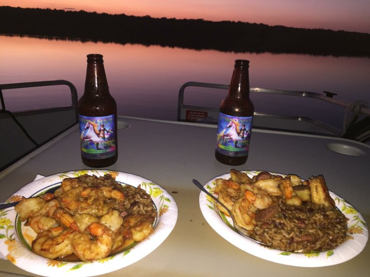 Jimmy cooked up blackened Gulf red shrimp, red beans and rice fortified with venison sausage. River living and eating is life simple!